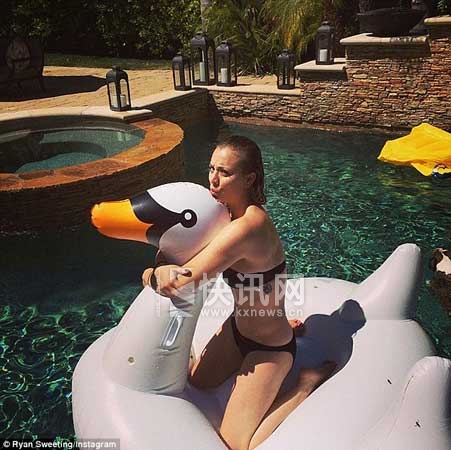 照片中,这位金发碧眼的美人身穿简单的黑色比基尼,抱着一个充气天鹅懒洋洋地漂浮在水塘中间,看起来光彩照人。她的湿发自然的垂到肩部,脸部未加粉饰,打趣地嘟起了嘴,所有的一切都让她浑身散发着迷人光彩。照片中还可以清楚地看到,她的腰部又出现了第三个新纹身,这是一个 中国 符号,象征着“忠实”。