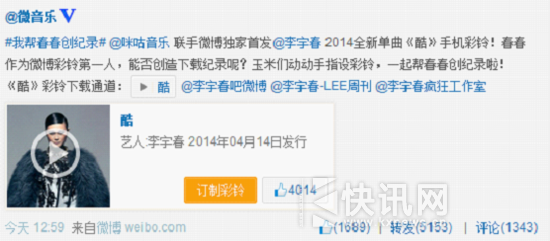 李宇春 彩铃首发还引发了 上的热门话题#我帮春春创纪录#,2个多 小时 话题讨论量就超过7万,话题PK数据则显示,92.9%的网友认为李宇春能够打破之前的下载纪录。