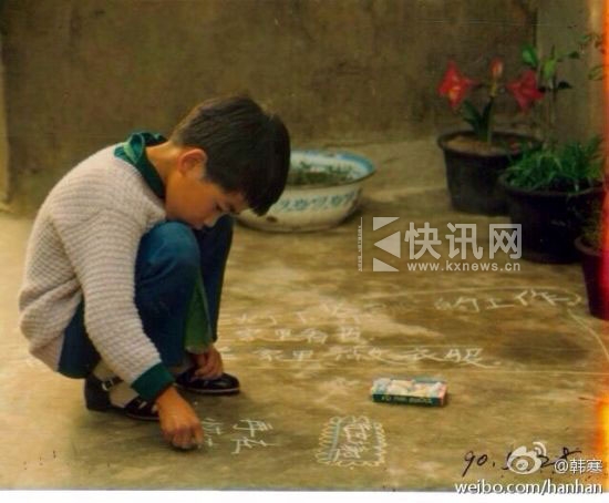 近日,韩寒分享了自己童年时的爱好,“二十四年后,我把这个习惯带去了剧组。”童年照片中,韩寒身穿白色上衣,蓝绿色裤子,搭配黑色凉鞋,蹲在院子里地上,用粉笔认真地写字,院子里的小花陪伴着韩寒;而二十四年后,韩寒在剧组有了新的小伙伴: 冯绍峰 和 陈柏霖 ,三人一起蹲在地上开始涂鸦。