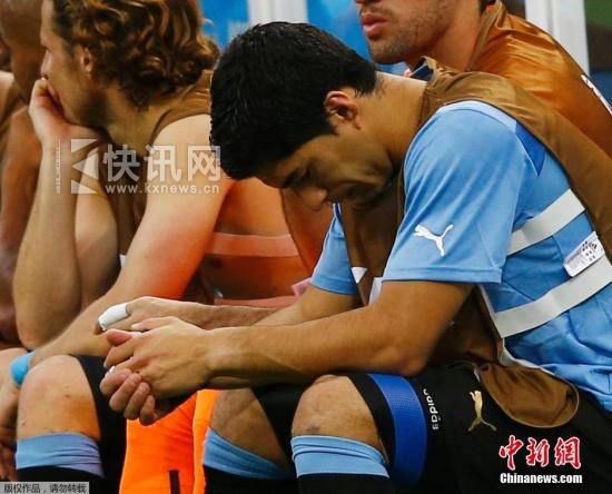 中新网6月15日电 在今天凌晨进行的一场巴西世界杯小组赛中,乌拉圭1-3惨败哥斯达黎加,小组出线希望渺茫。坐在替补席上的苏亚雷斯目睹了球队从领先到大比分落后的全过程,神情相当沮丧。
