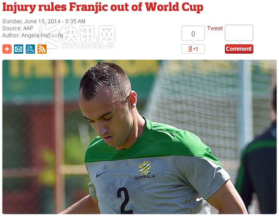 巴西世界杯正式开战,在昨天B组的首轮比赛中, 澳大利亚 1-3负于智利,出线形势岌岌可危。而更让澳大利亚人担心的是,赛后他们又得知了一个坏消息,主力右后卫弗兰季奇因腿部肌肉撕裂,已经确定告别本届世界杯,他也成为了巴西世界杯开赛后首位因伤告别的球员。