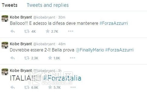 北京时间6月15日, 意大利 在 世界杯 小组赛2-1战胜英格兰,双方奉献了一场十分精彩的对攻战。 科比 在现场观看了西班牙1-5惨败荷兰的比赛后,今天又在推特上为意大利队呐喊助威,俨然是世界杯的懂球帝。