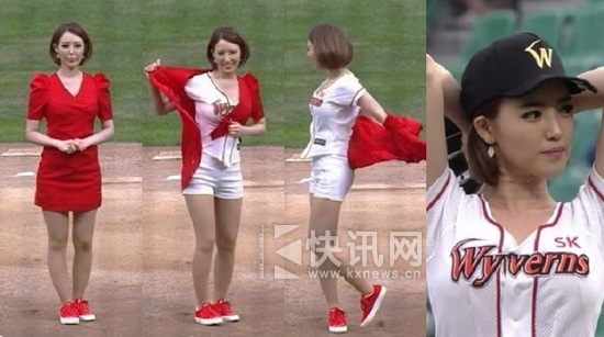 梁汉纳是韩国一家电视台的女主播,上周应邀化身某棒球队队开球“女神”,首先穿着深V红色正装登场,待亲切与全场球迷打 招呼后,一把脱下正装秀出该队球衣,而她的大胆动作也走红网络。