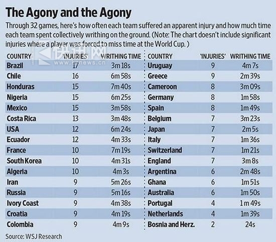 在足球赛场上,球员出现激烈的身体对抗是非常正常的事情,而球员在比较猛烈的对抗或者遭到对手的侵犯之后倒地,乃至受点小伤的情况也是非常常见的。最近,《华尔街日报》统计了一组非常有意思的数据,即32个球队在比赛中受到的造成小伤的次数(不包括那种让球员直接离场的重伤)以及因为这些小伤而在球场上倒地的时间,结果 巴西 成为被侵犯而导致小伤最多的球队, 洪都拉斯 则是成为最能“ 浪费时间 ”的球队。