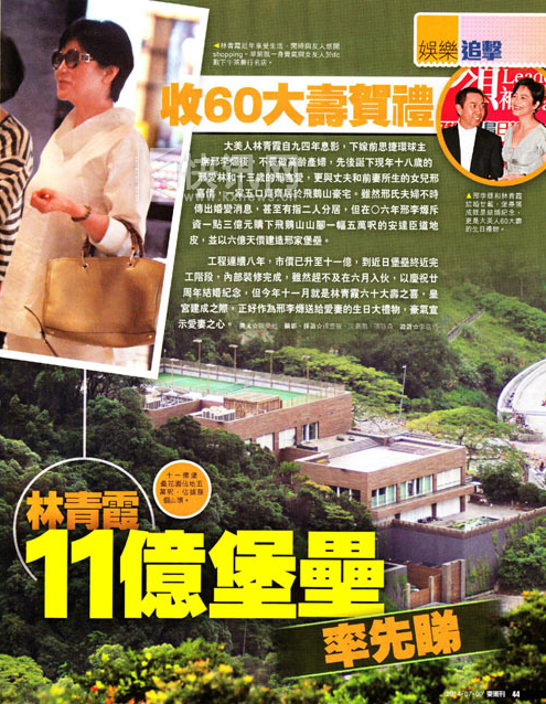 林青霞老公邢李2006年买下的飞鹅山土地,经过多年施工建造的豪宅总算落成。这片近5万英尺(约4645平方米)的土地当初买入花了1.3亿(港币,下同),加上装潢6亿左右,现在市值估计已达11亿。