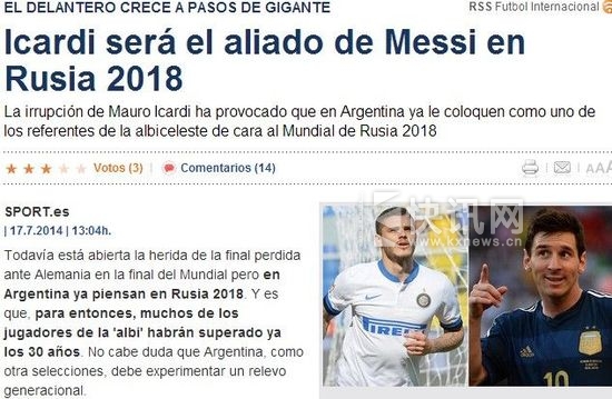 一批老将将退出阿根廷队,哪些新人顶上来?《每日体育报》着重指出,“国米巴蒂”伊卡尔迪很可能将是梅西在2018年最可信赖的攻击搭档。在本届世界杯中,伊瓜因和阿奎罗均表现平平,伊卡尔迪有可能在未来四年间成为重点培养对象。伊卡尔迪出道于巴萨青训营,他在2011年转投 桑普多利亚 ,上赛季在国米则打进了8球。