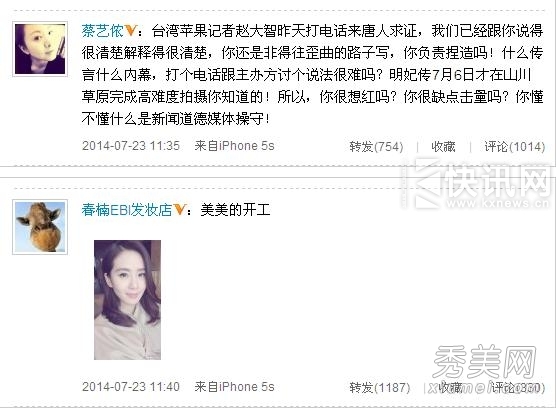 7月23日11:30分左右,唐人总裁蔡艺侬发 怒斥台媒记者,称其“非得网歪曲的路子写”、“负责捏造”,并质问其“你很想红吗?你很缺点击量吗?你懂不懂什么是新闻道德媒体操守!”似乎是为此前流传的刘诗诗耍大牌及怀孕的消息而指责记者无事生非。