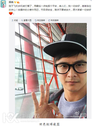 田亮今天下午对此事做了回应,他在 上写道:“刚下飞机手机被打爆了,用最后一点电报个平安,亲人们,我一切安好,谢谢各位的关心!拍摄中的小意外而已,节目很安全,跪求不要被放大,愿大家都一切安好!”并且晒出一张做出“OK”手势的照片,证明自己平安无事。