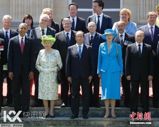 资料图:当地时间6月6日,法国Benouville,参加诺曼底登陆纪念活动的美国总统奥巴马、俄罗斯总统普京与与会各国领导人拍摄集体照。
