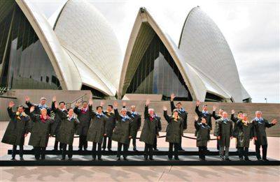 2007年,悉尼APEC会议,成员领导人穿当地传统服装合影。