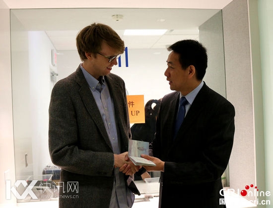 2014年11月12日,中国驻美大使馆参赞兼总领事阮平(右)在美国首都华盛顿中国驻美使馆签证处为埃德蒙-唐尼颁发首张有效期为10年的美国赴中国签证。(张旭 摄)