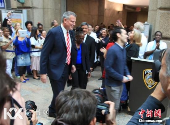 11日上午,在医护人员的掌声和欢呼声中,纽约市市长比尔·德布拉西奥在纽约贝尔维尤医疗中心(Bellevue Hospital Center)举行的新闻发布会上,宣布纽约首位也是目前唯一的埃博拉病毒感染者痊愈。