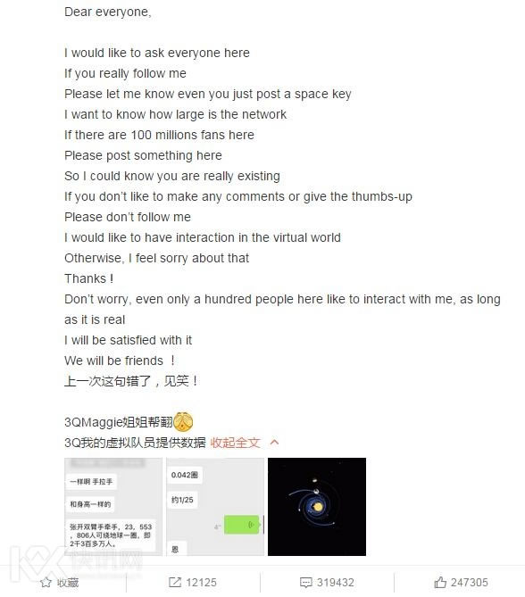 她还和网友们互动,说:“没关系只要是真实的哪怕只有100个人,和我玩我就很满足了,一个人的光波不可估计,一个真实的人却可以唠嗑”并附上英文。