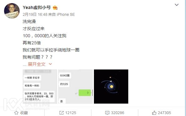 近日,郑爽小号随着她的“放飞自我”而得到了广泛的关注,截止到目前为止微博已经突破百万。对于这个数字,郑爽小号昨日发文说:“洗完澡才反应过来。100,0000的人关注我,再有25倍,我们就可以手拉手绕地球一圈。我有问题???”