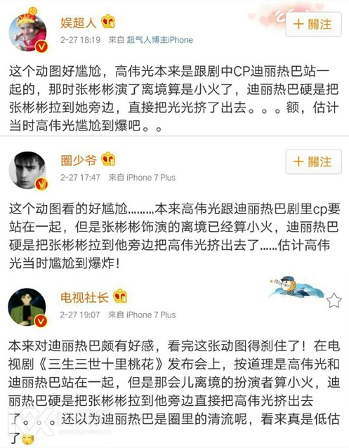 按照剧中人物设定,高伟光和迪丽热巴理应是站在一起的,但是那会儿离镜的扮演者张彬彬算小火,迪丽热巴就把张彬彬拉到他旁边直接把高伟光挤出去了↓
