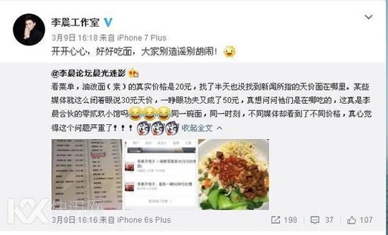 有网友实地调查后发布微博称:“看菜单,油泼面(素)的真实价格是20元,找了半天也没找到新闻所指的天价面在哪里。某些媒体就这么闭着眼说30元天价,一睁眼功夫又成了50元,真想问问他们是在哪吃的,这真是李晨合伙的零贰玖小馆吗?同一碗面,同一时刻,不同媒体却看到了不同价格,真心觉得这个问题严重了!!!”李晨工作室转发此微博并评论到:“开开心心,好好吃面,大家别造谣别胡闹!”