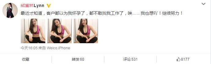 3月10日,熊黛林在微博晒出健身照片,并写道:“最近才知道,客户都以为我怀孕了,都不敢找我工作了,唉……我也想吖!继续努力! ”照片中,熊黛林穿着运动内衣,秀出平坦腹部,一头长发搭在肩上,身材十分抢镜。