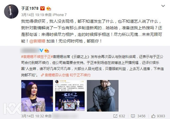 凤凰网娱乐讯 3月14日,于正在微博回应了袁姗姗与于正公司合约到期不续约的事件,于正发文表示:“我觉得很好笑,我人没去现场,都不知道发生了什么,也不知道艺人说了什么,就针对剧情解说了一下也有那么多制造新闻的,哈哈哈,准备送我上热搜吗?还是那句话,来的时候尽力相护,走的时候挥手相送!尽力所以无愧,未来无限可能!@袁姗姗加油!无论何时何地,都挺你!”