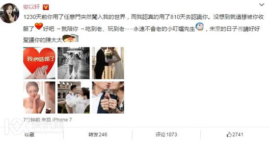 3月15日,安以轩在微博晒出自己结婚的消息,安以轩发文说:“1230天前你用了任意门突然闯入我的世界,而我认真的用了810天去认识你。没想到就这样被你收服了好吧~就陪你~吃到老、玩到老……永远不会老的小叮当先生,未来的日子里请好好爱护你的陈太太”。