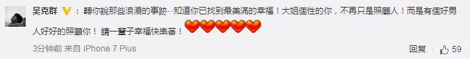 明星纷纷送上祝福,好友罗志祥说:“听你说那些浪漫的事迹……知道你已找到最美满的幸福!大姐个性的你,不再只是照顾人!而是有个好男人好好的照顾你!请一辈子幸福快乐着!”王中磊也送上祝福还称要坐等喜酒。
