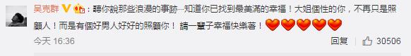 随后,吴克羣发微博祝福,“听你说那些感动的事迹…知道你已找到最美满的幸福!大姐个性的你,不再只是照顾人!而是有个好男人好好照顾你!请一辈子幸福快乐着!”