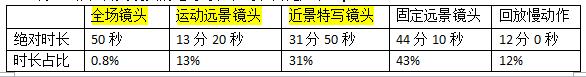 这场比赛转播时长:上半场因为有球员受伤,时长52分25秒;下半场49分55秒,共计102分20秒;各类镜头的绝对时长和时长占比如下: