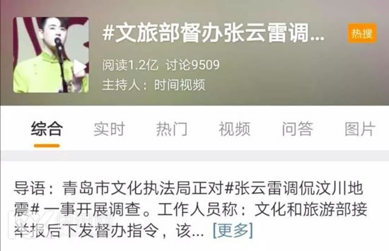 昨晚,张云雷调侃汶川地震一事又有新消息传来...#文旅部督办张云雷调侃事件#的话题占据微博热搜榜!
