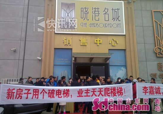 中国山东网青岛频道12月11日讯 8日上午,青岛晓港名城的近百位业主聚集在售楼中心门前,要求开发商和记黄埔更换故障频发的电梯,其中有业主拨打了中国山东网青岛频道热线(0532-66568111)。记者赶到现场了解到,出现问题的电梯约有40部,主要集中在和记黄埔开发的晓港名城一期高层,业主反映在交房后半年的时间里,“几乎每天都会有至少一部电梯出问题”,仅业主记录在案的故障次数就达到了52次,险情频发。开发商方面对记者表示,电梯故障频发是因为楼盘靠海近,风大对电梯有影响。