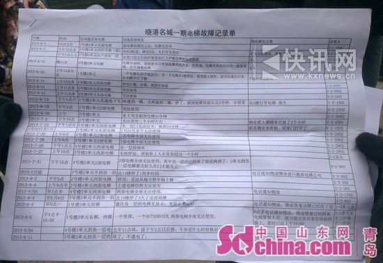 “前几天送小孩上幼儿园,单元内的两部电梯都坏了,我抱着两个孩子走下楼,花了快一个小时的时间。”住在32楼的富先生告诉记者,由于电梯因故障停运,他曾一天内两次爬楼梯回家,“一次两次还能当成锻炼身体,但总不能天天爬吧。”记者在业主提供的一份电梯故障统计中看到,自2013年6月1日至12月1日期间,光业主记录在案的故障次数就达到了52次。