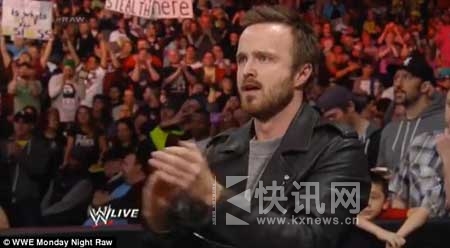 因在AMC有线电视台的《绝命毒师》中的精彩演出而为观众熟知,并最终凭此剧获得第62届艾美奖、第64届艾美奖最佳男配角奖的亚伦•保罗,在本周一晚在芝加哥的比赛中引起了很大的骚动。一件皮夹克和皮裤套一件灰色的T恤,亚伦看起来帅气逼人。当拳击场边上的观众变得激动的时候,他站在拳击手道夫•齐格勒(Dolph Ziggler)的左边,挥舞着双手鼓励观众更加狂野。在齐格勒和阿尔贝托•德•里奥的比赛中,亚伦甚至跳上了解说员的桌子并破口大骂。可以说这场比赛是齐格勒和亚伦的共同胜利。