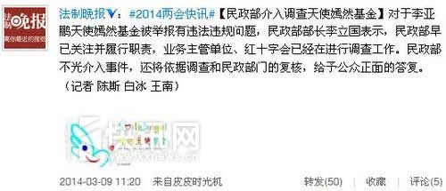 对于李亚鹏天使嫣然基金被举报有违法违规问题,民政部部长李立国表示,民政部早已关注并履行职责,业务主管单位、红十字会已经在进行调查工作。民政部不光介入事件,还将依据调查和民政部门的复核,给予公众正面的答复。
