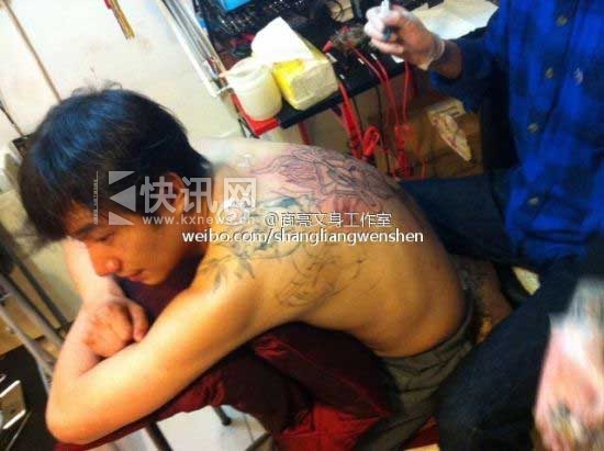 文章曾在节目中展示过自己腿部和背部的纹身,3月9日,文章在店内纹身的照片曝光,赤膊趴在椅背的文章背部刺满了纹身,似在以前的纹身基础上再扩大范围。粉丝看的心疼,表示不理解为什么“纹身会上瘾”,而文章早前也透露这是为爱女文君竹所作,图案为佛手中执的一支竹子,寓意“掌上明竹”。此番看来,极有可能是为刚刚出生的二女儿再刺新的纹身。(新娱)