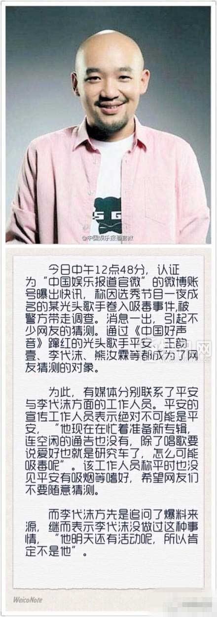 人民网北京3月18日电 今日中午12点48分左右,认证为“中国娱乐报道官微”的 账号连发两条 快讯,称因选秀节目一夜成名的某光头歌手卷入吸毒事件,被警方带走调查。随后又称该名歌手确定为李代沫,但李代沫方工作人员否认此事。