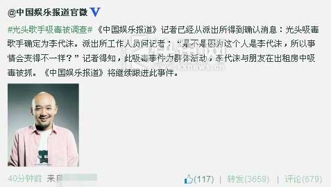 “ 中国 娱乐报道官微”的 账号曝李代沫吸毒被警方带走
