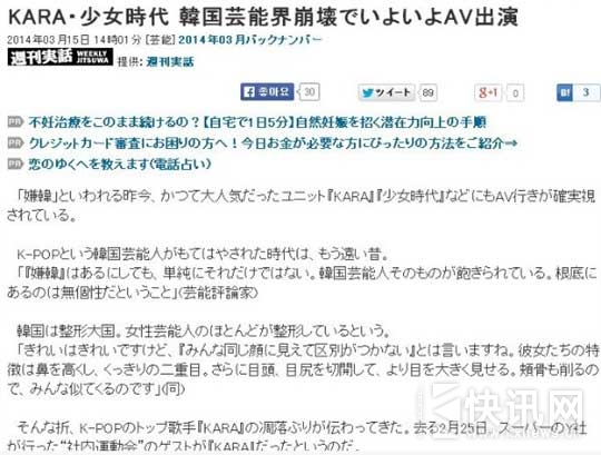据《周刊实话》报道,“随着反韩流情绪高涨,过去人气颇高的KARA和少女时代已确定拍摄AV。由于毫无个性,日本大众开始厌烦韩国艺人”。