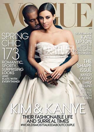 与此同时,这对金童玉女的合影也刊登在了《vogue》的封面上,但却引来了诸多读者的批评与网友的恶搞。在这张照片中,卡戴珊身穿洁白的礼服,维斯特在身后搂住她的腰,并且深情的望着她的肩膀。