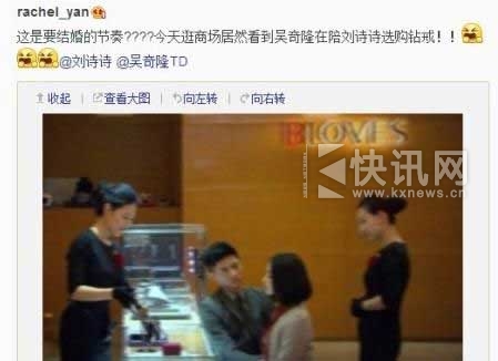 3月27日,网友“rachel_yan”拍到 吴奇隆 和 刘诗诗 疑似在珠宝店内买婚戒的照片,引发网友猜测两人可能好事将近。但也有不少网友对消息表示质疑,称“别傻了,看造型都看得出是步步惊情的剧照啊。”