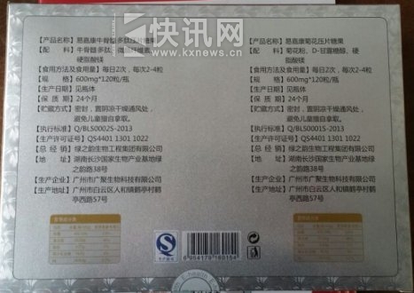 3.15前夕,记者接到消费者投诉称其720元购买的”易嘉康套装”保健品可能是假冒伪劣产品。套装内含”易嘉康牛骨髓多肽压片糖果”及”易嘉康菊花压片糖果”,两个产品用的是同一个生产许可证QS4401 1301 1022。说是糖果制品而里面的成分却显示为牛骨髓多肽,微晶纤维素,硬脂酸镁及菊花粉等。这显然不是糖果制品的原料,消费者希望帮助调查核实。