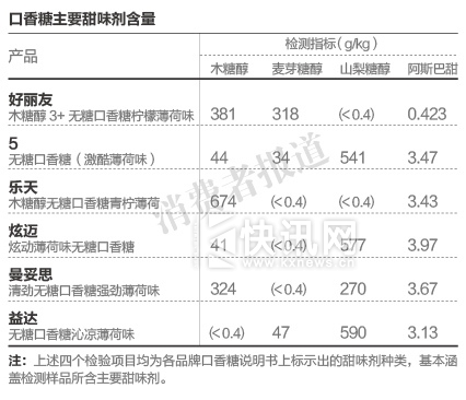 此次《消费者报道》选择口香糖中木糖醇、麦芽糖醇、山梨糖醇和阿斯巴甜四种主要的糖醇和甜味剂进行第三方检测。结果显示,以木糖醇护齿概念为主的口香糖中,乐天木糖醇含量最高,益达无糖口香糖沁凉薄荷味并未添加木糖醇。此外不同品牌的产品添加的量各有不同。