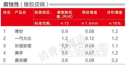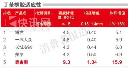 为此,本刊对5款制动液的腐蚀性和橡胶适应性进行了检测。结果发现,作为国产制动液第一大品牌的奥吉娜在这两项指标中均垫底,其中橡胶适应性的检测结果已接近标准限值,容易造成漏油风险。