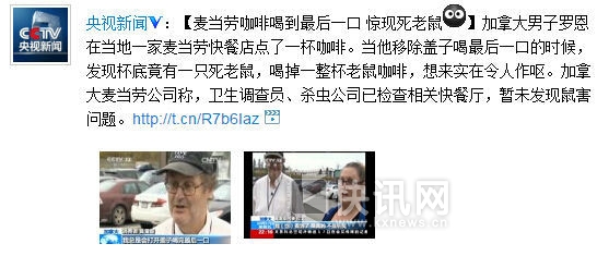 人民网 10月19日电 据央视官方 “央视新闻”消息,日前,加拿大一名男子罗恩在当地一家麦当劳 [ ] 快餐店点了一杯咖啡,喝到最后一口时,突然发现杯底有一只死老鼠!