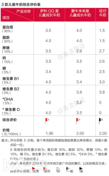以下为本刊综合这次检测数据做出的3款儿童牛奶的综合评价结果,排名从高至低分别为伊利、蒙牛、旺仔。