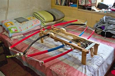 放在床上的“诸葛连弩”。昨日,廖师傅展示自制的诸葛连弩。