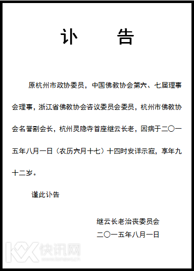 原杭州市政协委员,中国佛教协会第六、七届理事会理事,浙江省佛教协会咨议委员会委员,杭州市佛教协会名誉副会长,杭州灵隐寺首座继云长老,因病于公元二O一五年八月一日(农历六月十七)十四时在杭州灵隐寺安详示寂,享年九十二岁。