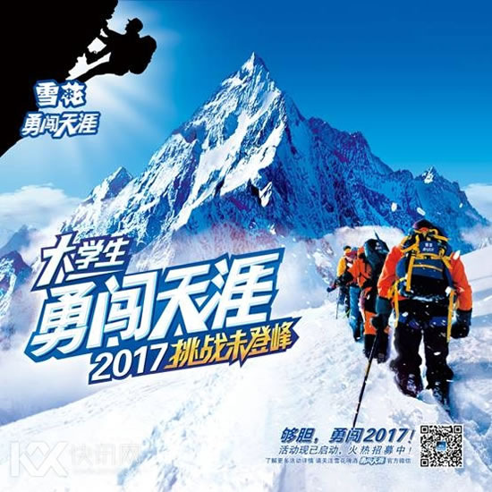 就是现在,2017雪花勇闯天涯大学生挑战未登峰活动正在等待着洋溢青春热血的大学生勇士们挑战未登峰,将勇闯精神完美诠释。挑战未登峰正如挑战自我,大学生面对未来的人生充满未知也充满新知,只要以进取的态度和精神挑战每一个未知,就可以实现一个更加勇敢积极的人生。