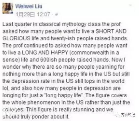 “在上一节的古典神话课上,教授问,有多少人想要短暂却又辉煌的人生,有20人左右举手。教授继续说:有多少人想要快乐而长久的人生,600人左右举了手。现在我知道为什么有这么多美国人向往快乐无忧的生活,但他们的抑郁率却世界排名靠前了。又有多少人抑郁的人渴望着“快乐而长久”的生活呢?”