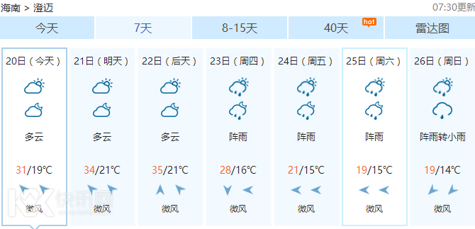 20日夜间到21日白天:海南岛南部多云,西部晴间多云,局地午后有雷阵雨,其余地区晴间多云。