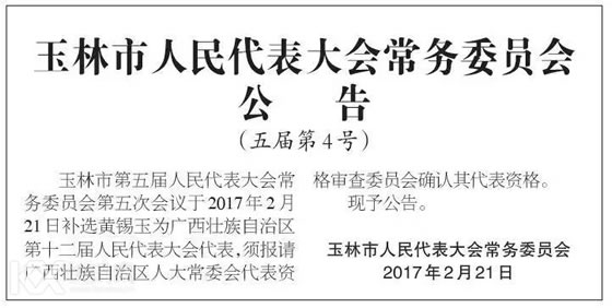 会议听取和审议了玉林市人大常委会代表资格审查委员会关于代表资格审查的报告;依法补选了黄锡玉同志为自治区第十二届人大代表;表决通过了有关人事任免名单。王凯为新任命的国家机关工作人员颁发了任命书。随后,举行了新任命国家机关工作人员向宪法宣誓仪式。