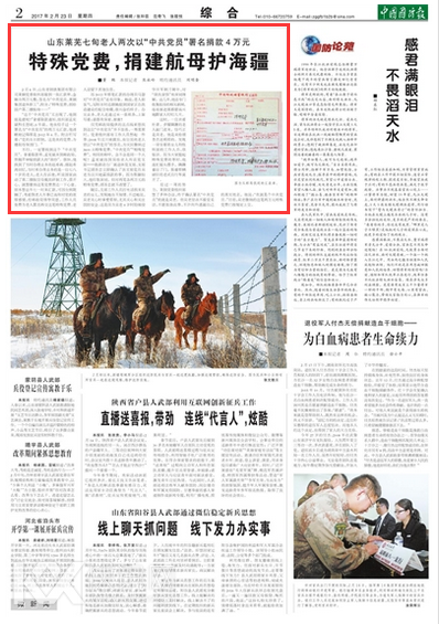 2月6日,山东省钢铁集团有限公司莱钢党委组织部接到一张汇款单,金额为两万元整,签名为“中共党员、莱钢集团退休职工”,附言:“特殊党费,捐给国产第二艘航母……”