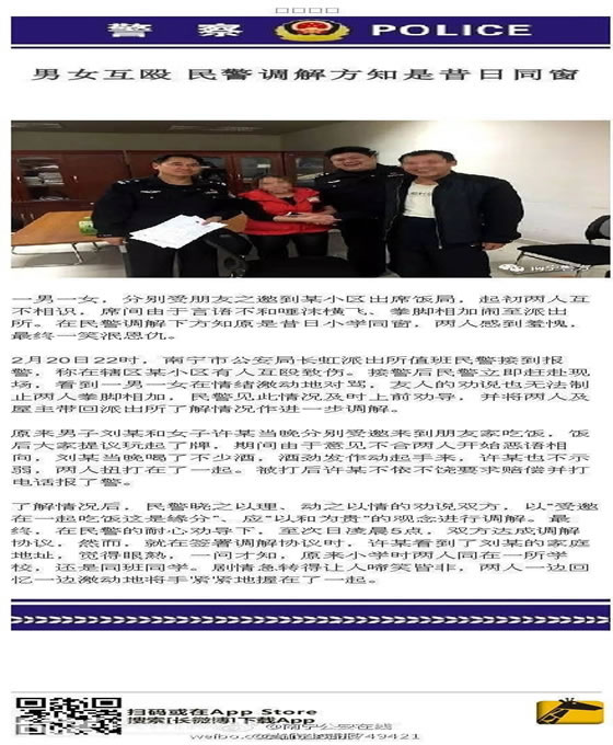 原标题:南宁一对男女互殴后发现是同学,在警局留下合影